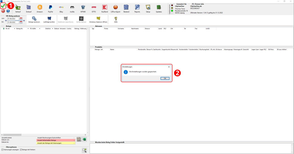 In der Hauptansicht der Fibu-Schnittstelle drücken Sie oben links das "grüne Häckchen" (Punkt 1). Sie erhalten danach noch eine Bestätigung "Die Einstellungen wurden gespeichert" (Punkt 2), welche sich in einem neuen Fenster öffnet. Schliessen Sie das Fenster, indem Sie einfach den "OK" Button drücken.