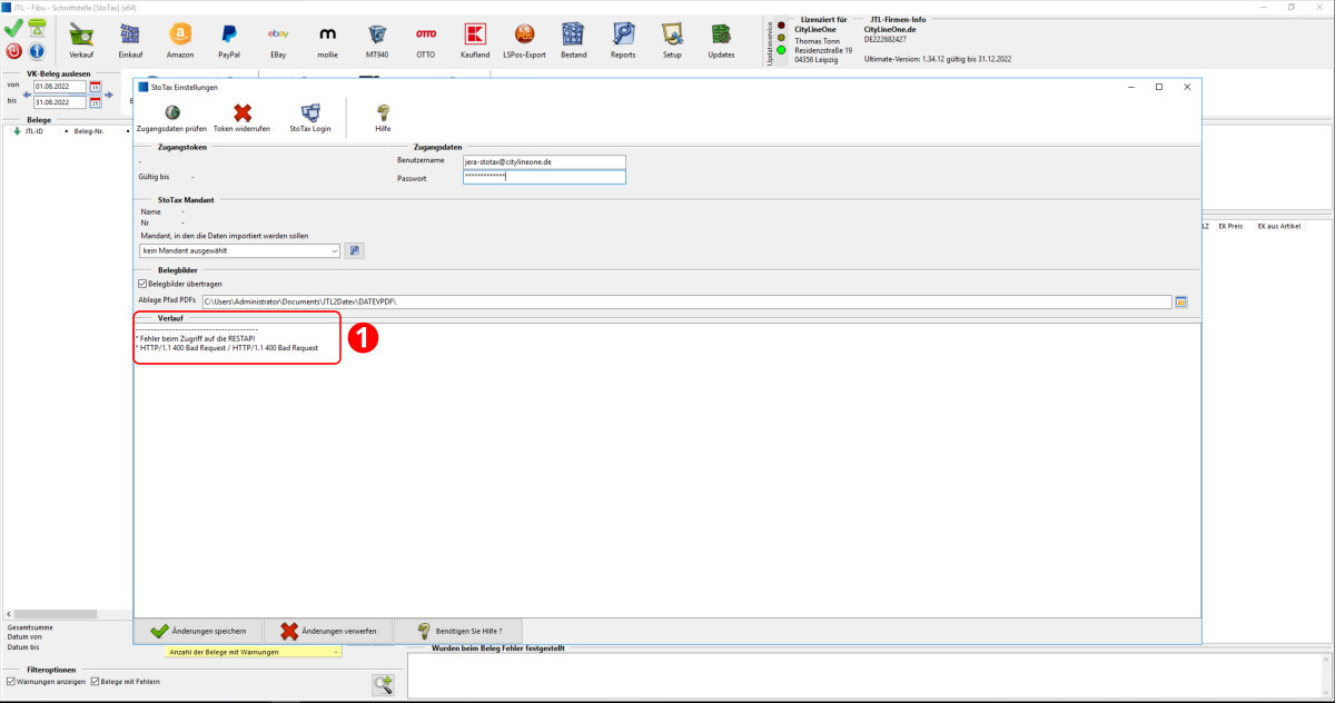 Falls Ihnen im Verlauf (Punkt 1) ein Fehler beim Zugriff auf die RESTAPI angezeigt wird, ist das ein Anzeichen dafür, dass das Stotax-Select-Premium Paket nicht von Ihrem Steuerberater freigeschalten worden ist. Bitte setzen Sie sich dazu mit Ihrem Steuerberater in Verbindung.
