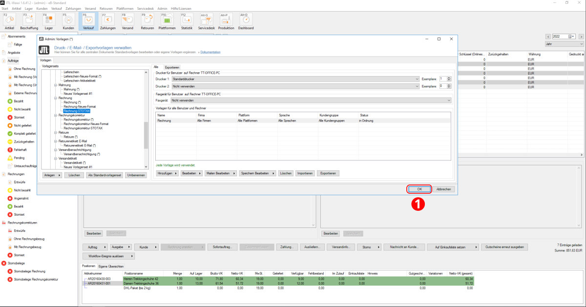 Nachdem Sie die beiden Vorlagen "Rechnung" und "Rechnungskorrektur" für den Stotax Upload angepasst haben, klicken Sie den "OK" Button (Punkt 1).